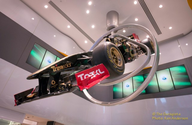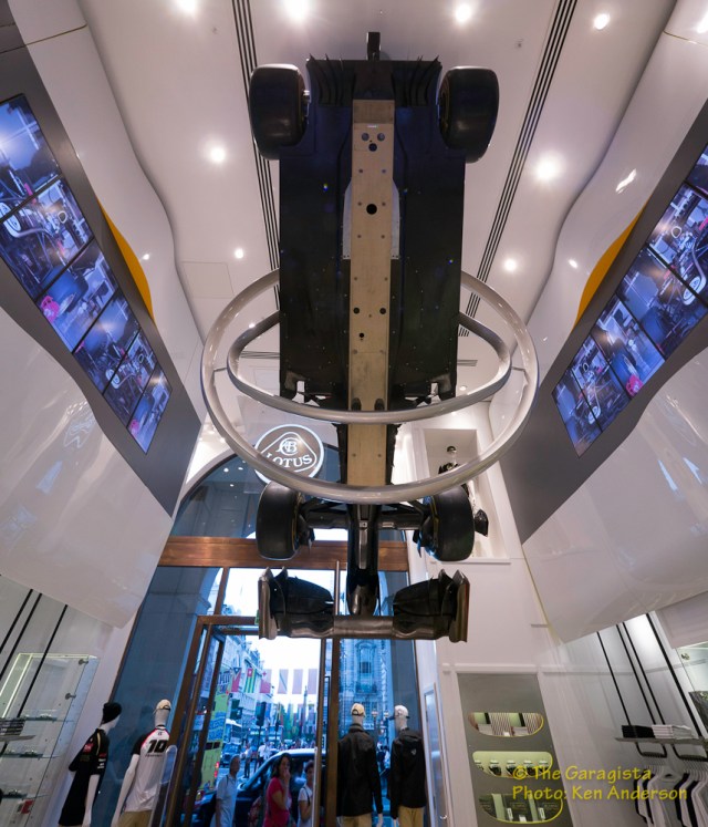 The car is artfully suspended through the middle of a larger than life Lotus logo. When was the last time you had the chance to view a current Formula One car….from the bottom?