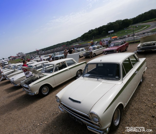 The paddock and pits were filled with clubs, vendor displays, and plenty of rare and exciting cars. Lotus Cortina BMK 723A was on display and is a real time capsule with only 3975 miles on the clock. Bruce Reynolds, the mastermind of The Great Train Robbery in 1963, owned the car. It was confiscated by the police and was later acquired by Lotus in 1980 and added to their car collection. The car is rumored to still have the original tires from 1963.