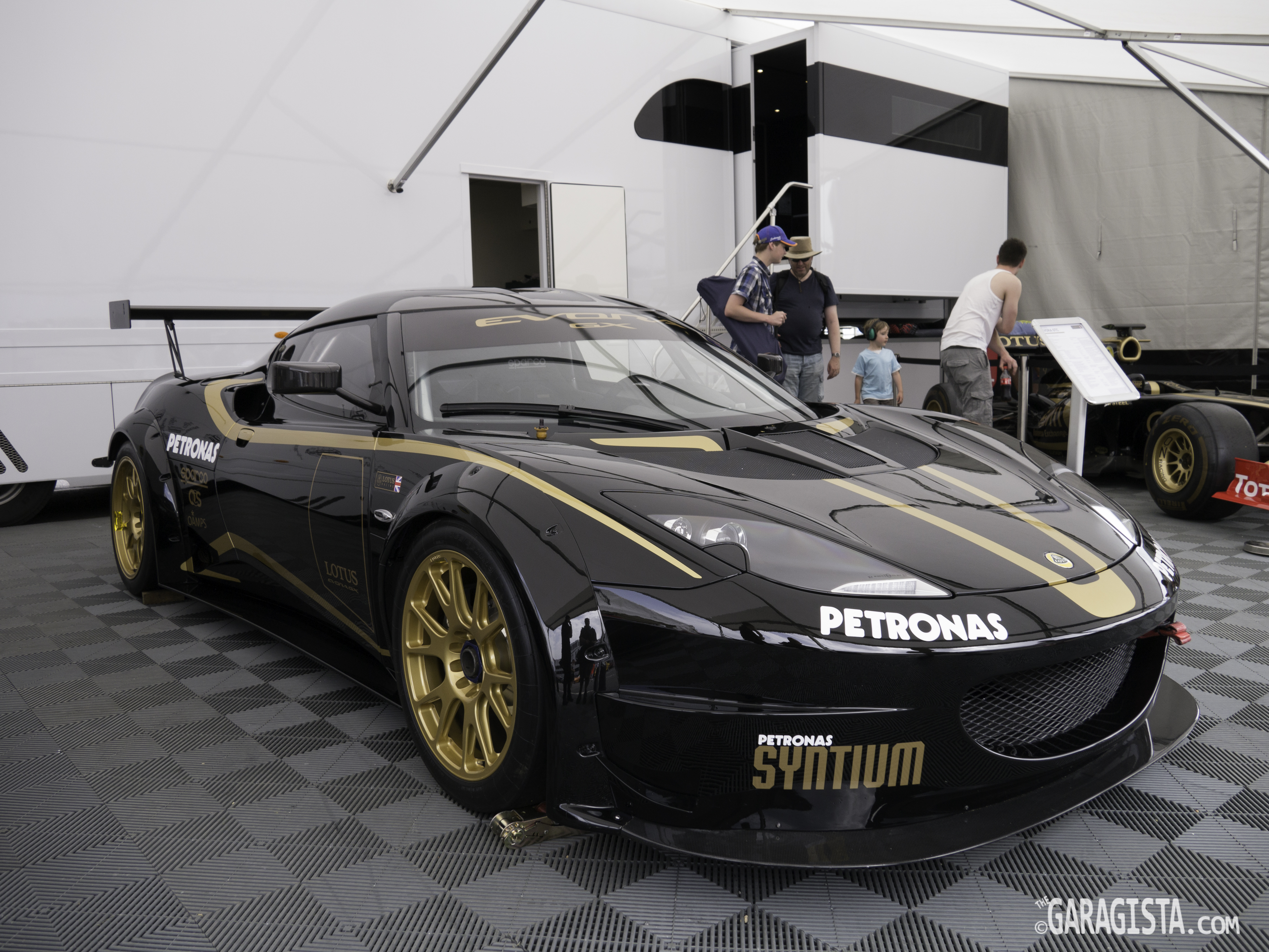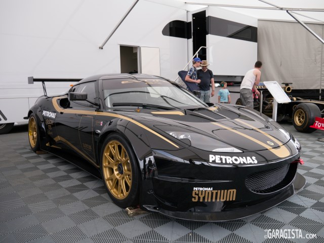 Lotus displayed their recently announced Evora GX for the Grand Am series in the USA. The larger wheel arch flares dramatically change the appearance of the car for the better. There are numerous modifications added to homologate the car for the American series including required fuel fillers, and other safety devices. The car weighs a mere 1150kg with carbon fiber roof and doors and is powered by a 4 litre , 440BHP V6 mated to an XTRAC six speed sequential paddle shift gear box.