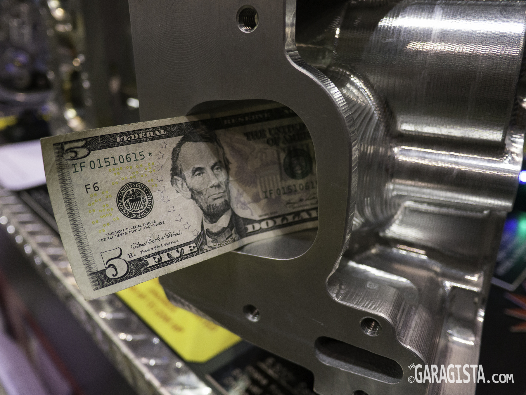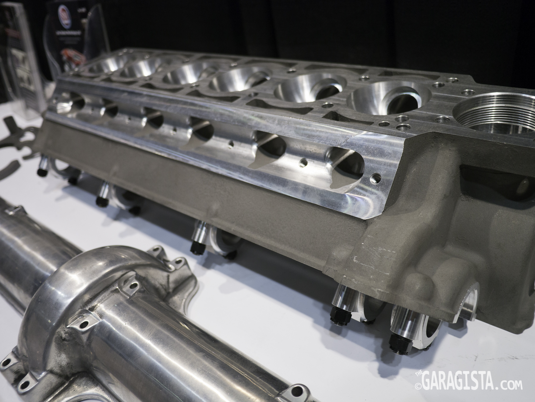 Sonny’s Racing Engines displayed some nicely machined GM cylinder heads. Gone are the days when an engine builder or cylinder head technician spends hours with a grinder reshaping ports and combustion chambers. Top teams and engine builders rely on 5 axis CNC machines to accurately port and shape the cylinder heads for maximum flow.  The five dollar bill gives you a feel for the intake port size.